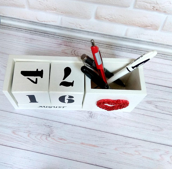 Portalápices diseñado con un calendario. Será más fácil gestionar tu día a día con este imprescindible organizador de madera. Su diseño es sencillo, elegante y atractivo.